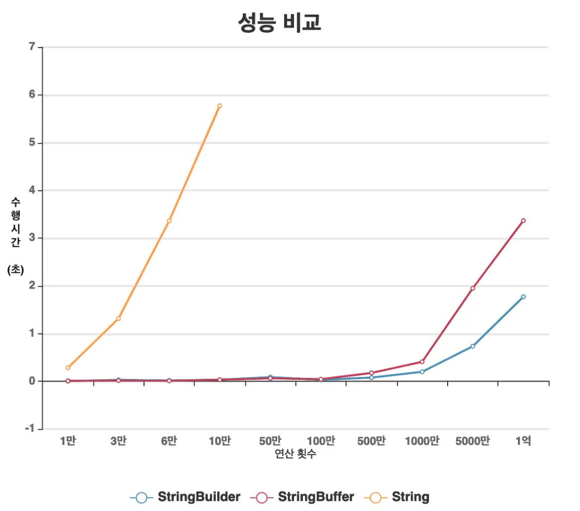 StringBuffer와 StringBuilder의 성능을 비교하면, 당연하게도 동기화를 수행하는 StringBuffer가 조금 더 느리다.