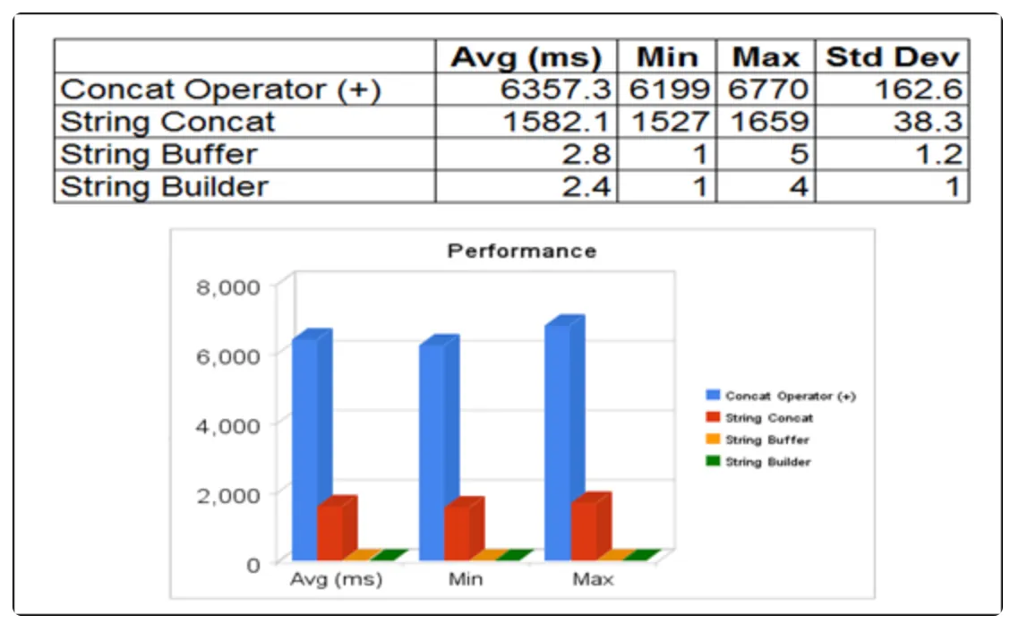 String 객체에는 concat이라는 문자열을 합치는 메서드를 지원하는데, 이 메서드 역시 + 연산자보다는 빠를 뿐 호출할 때마다 새로운 문자열을 재구성하여 반환하기 때문에 StringBuffer나 StringBuilder에 비해 느릴 수 밖에 없다.