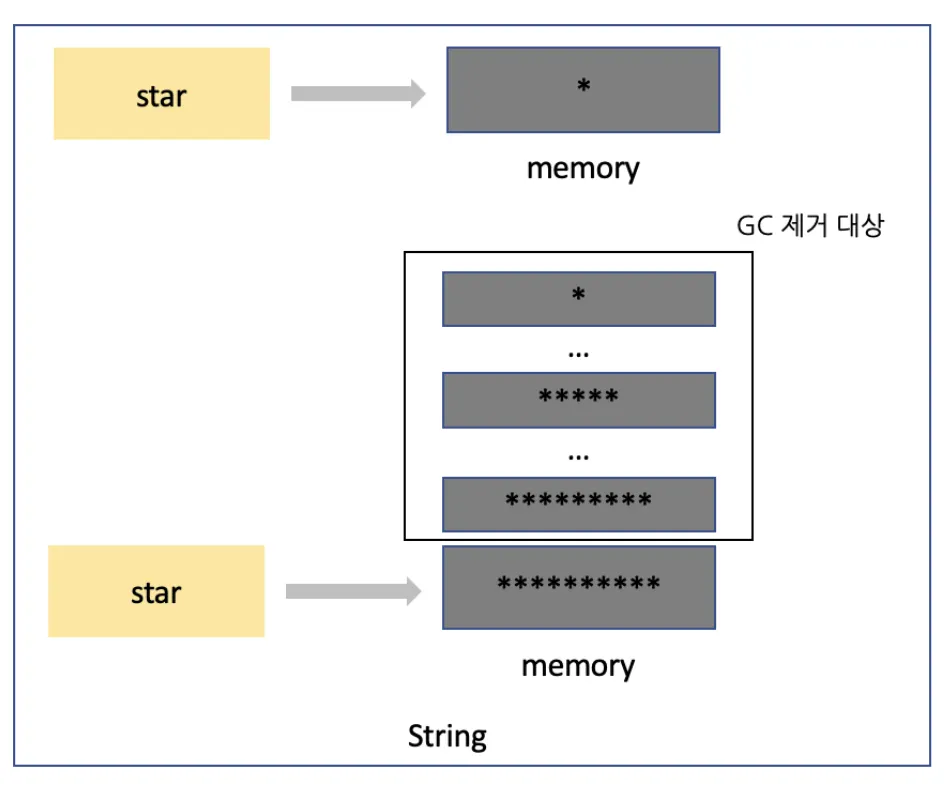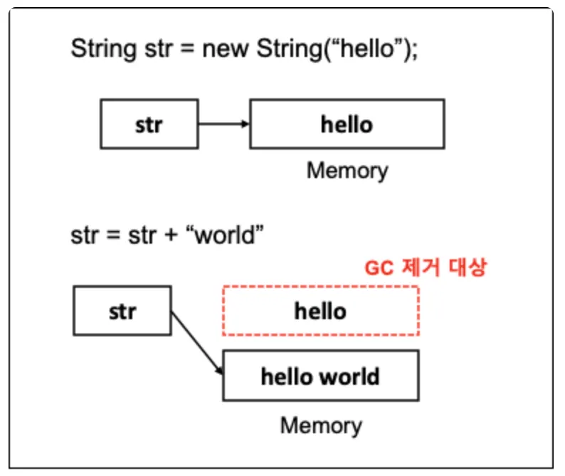 String 객체의 경우, 이처럼 매 연산마다 새로운 객체를 Heap 영역에 선언하고 참조를 바꾸어 추후 Garbage Collection에 의해 제거 된다.