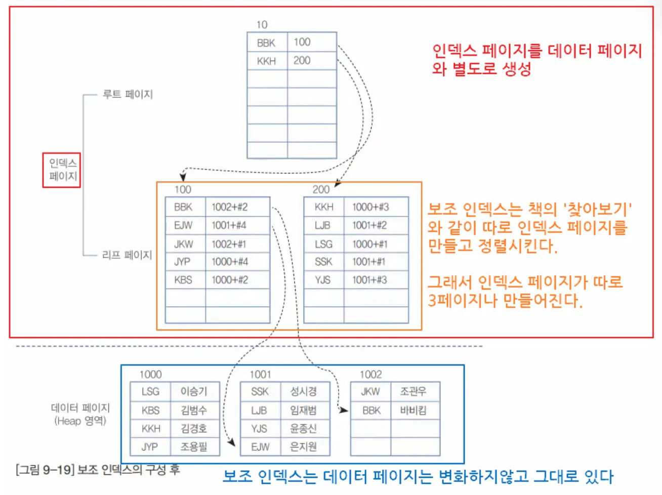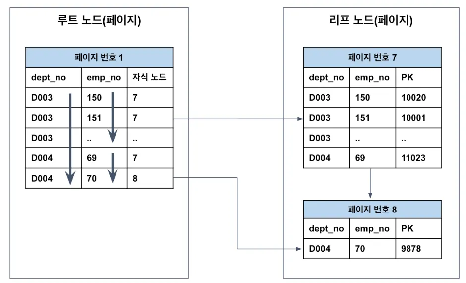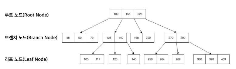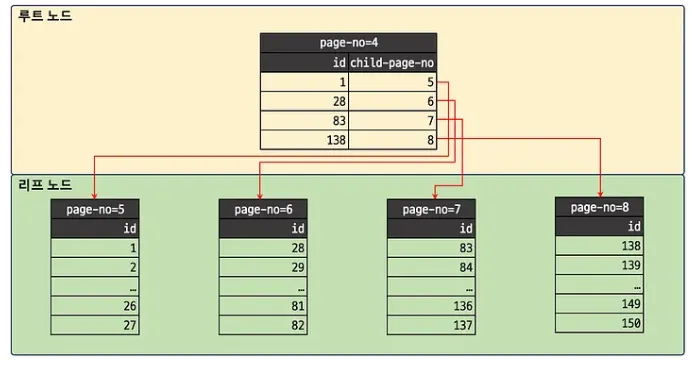 이와 같이 루트 노드 - 브랜치 노드 - 리프 노드 구조를 갖는 B-tree에서 인덱스는 각 노드를 페이지로 구성하여 저장한다.