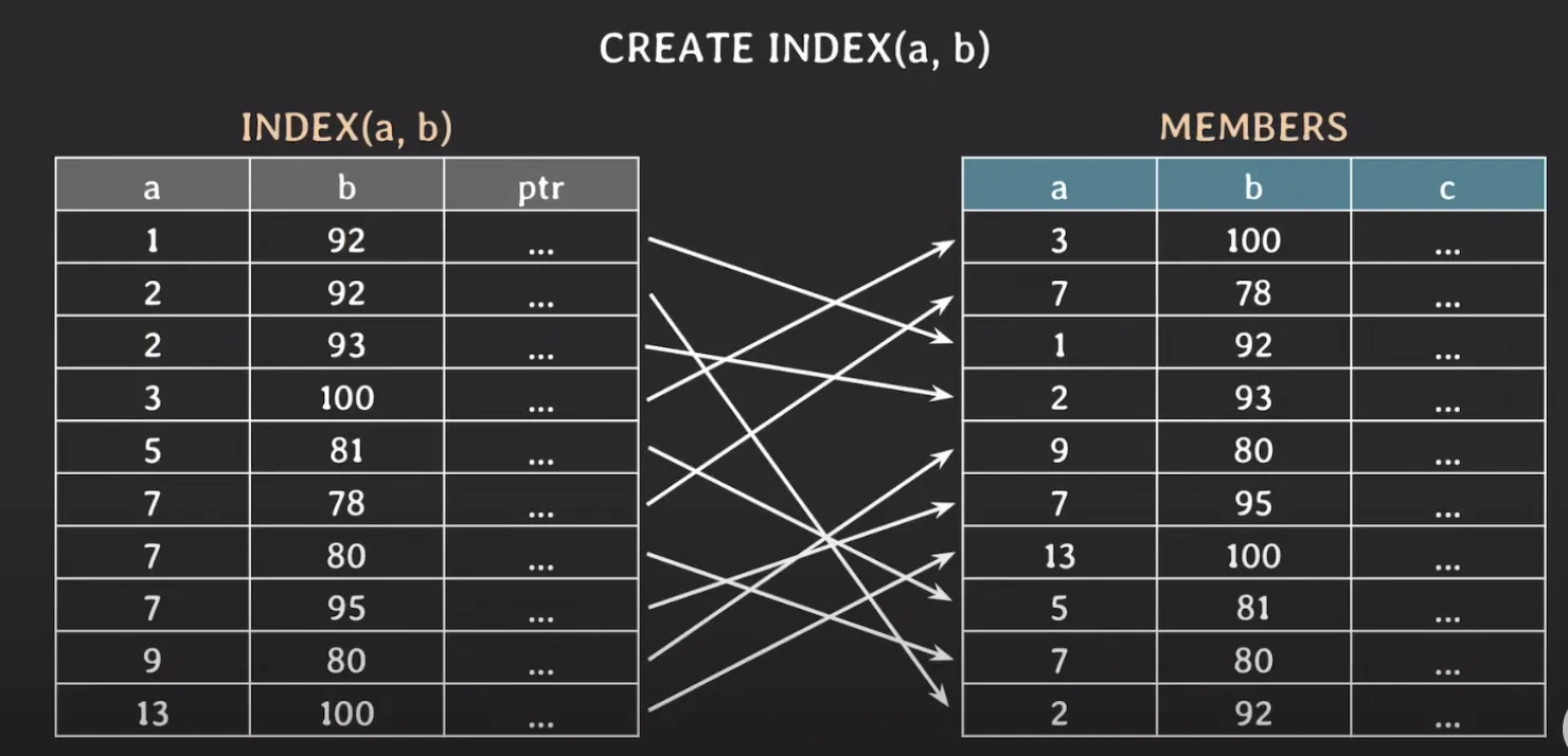 리프 노드에는 위와 같이 a → b 순서로 정렬하여 인덱스를 생성한다. 만약 a, b, c 3개의 컬럼을 사용하여 인덱스를 생성한다면, a 컬럼 기준으로 정렬 - a 컬럼이 같은 경우 b 컬럼으로 정렬 - b 컬럼까지 같은 경우 c 컬럼으로 정렬 이와 같은 방식으로 순차적으로 정렬한다.