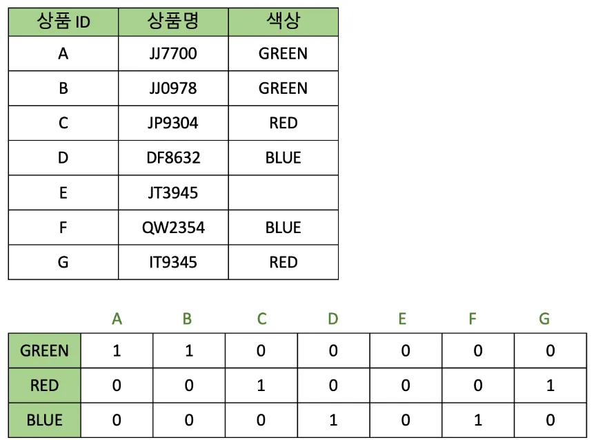 인덱스 컬럼의 데이터를 Bit 값인 0 또는 1로 변환하여 인덱스 키로 사용하는 방법으로, 카디널리티가 낮은 컬럼에서 효과적인 성능 향상 효과를 얻을 수 있다. 또한 BitMap을 사용하기 때문에 연산속도가 빠르고 저장 공간이 작다.