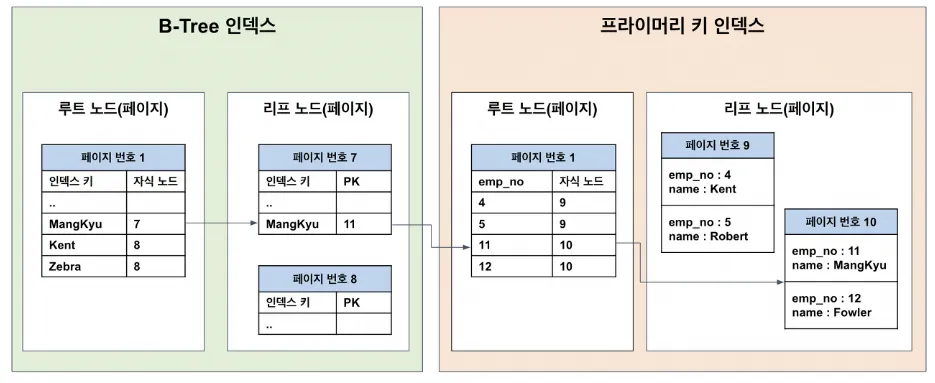 PK 인덱스인 클러스터 인덱스의 경우에는 (PK, 실제 레코드 데이터) 형태로 저장이 되고, 보조 인덱스의 경우에는 (인덱스 키, PK) 형태로 저장되어 있어 보조 인덱스를 통해 PK를 얻은 후 클러스터 인덱스를 다시 타서 레코드를 가져온다. 이런 구조를 통해 조회하는 이유는, 인덱스는 테이블과 독립적인 공간에 저장되기 때문에 데이터를 조회하기 위해서는 먼저 PK를 찾고 그 이후에 PK를 따라 실제 레코드를 읽어온다.