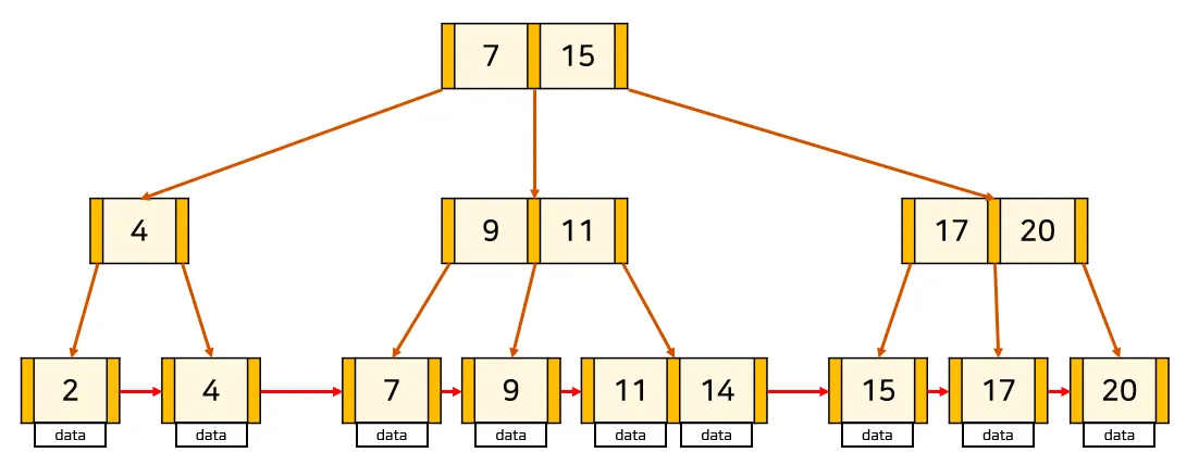 B-tree는 하나의 노드에 여러 값을 저장할 수 있고 두 개 이상의 자식을 가질 수 있는 트리 구조를 말한다. 하나의 노드에 여러 값을 저장하기 때문에, 이진 트리보다 훨씬 많은 데이터를 정렬을 유지하며 효율적으로 저장할 수 있다. 또한 균형 트리(balanced-tree)이기 때문에, 최악의 경우에도 O(logN)의 검색 성능을 보장한다.