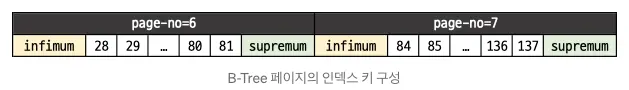 MySQL의 인덱스를 구성하는 페이지는 위와 같이 페이지의 맨 앞과 맨 뒤에 infimum과 supremum 인덱스 레코드를 삽입하여 저장한다. 이를 Gap-lock이나 Nextkey-lock에 활용하여 동시성 제어를 수행하게 된다.