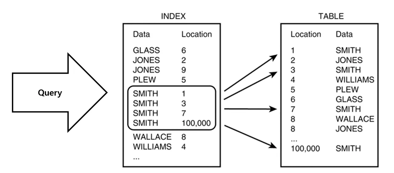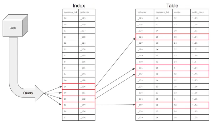 위 그림처럼 인덱스는 데이터베이스 내의 특정 컬럼(열)이나 컬럼들의 조합(복합 인덱스)으로 해당 값이 저장된 레코드(행)의 위치를 매핑하여 데이터 베이스 쿼리의 성능을 최적화한다.