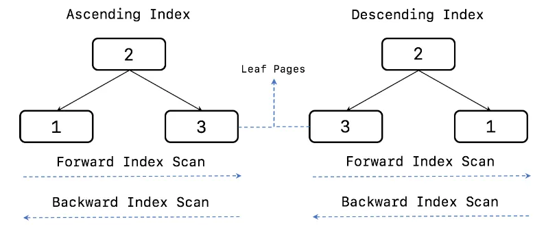 이와 같이 인덱스가 정렬된 순서로 읽는 것을 Forward Index Scan(정순 인덱스 스캔)이라 부르고, 반대 방향으로 읽는 것을 Backward Index Scan(역순 인덱스 스캔)이라 부른다.