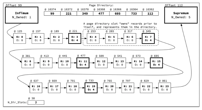 리프 노드의 한 페이지 안에는 수많은 레코드가 저장될 수 있는데, 이 많은 레코드를 하나씩 순차적으로 비교한다면 레코드 검색이 상당히 느릴 것이다. 때문에 정렬된 레코드를 4~8개씩 묶어서 별도의 리스트로 관리한다.