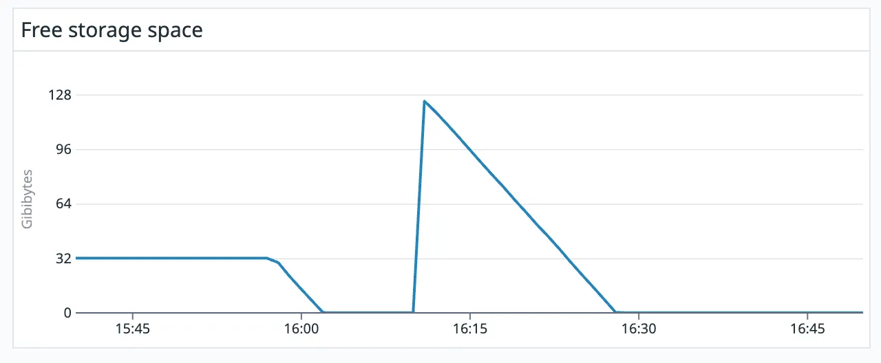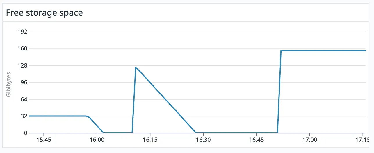 디스크의 용량이 급격하게 줄어들었다. 할당된 80GB의 용량에서 여유 공간 32GB를 유지하다가, 16시 언저리를 기점으로 용량이 급속도로 줄어들었다. 그에 자동 증설 설정에 따라 200기가로 용량이 증가했지만, 그마저도 굉장히 빠른 속도로 20분 정도만에 다 소진되어 잔여 여유 공간이 0으로 떨어졌다.