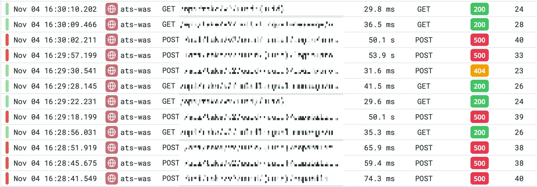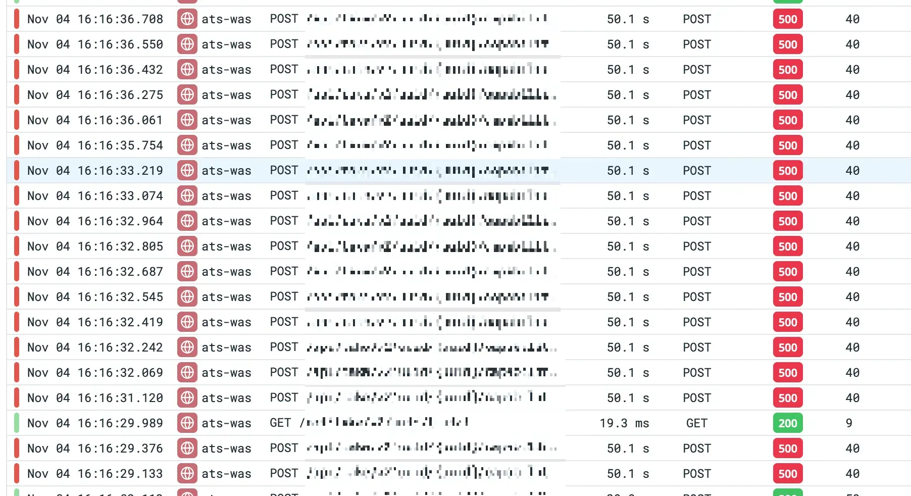 요청들을 보면 실패하는 요청은 전부 POST 요청이고, GET 요청은 응답에 성공한다. 회사의 서버는 조회를 제외한 CUD에 대해 로그를 남긴다. 디스크 용량이 부족해졌기 때문에, CUD를 수행하는 POST 요청에 대해 binlog를 남기기 위해 여유 공간이 생길 때까지 대기하고 50초 이후에 timeout이 발생한 것으로 보인다.
