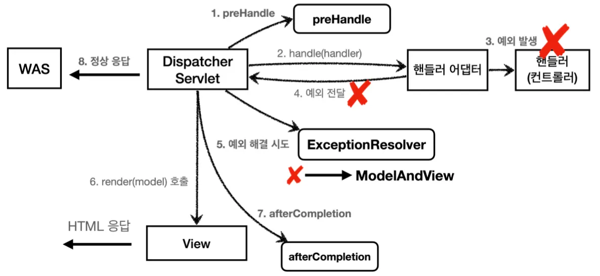이와 같이 HandlerExceptionResolver에서 오류를 처리하면, 예외가 발생하더라도 서블릿 컨테이너까지 전달되지 않고 스프링 MVC 내에서 예외 처리가 끝나게 된다. 때문에 추가적인 내부 프로세스를 통해 다시 컨트롤러를 호출하는 번거롭고 비효율적인 과정이 수행되지 않는 것이 핵심이다.