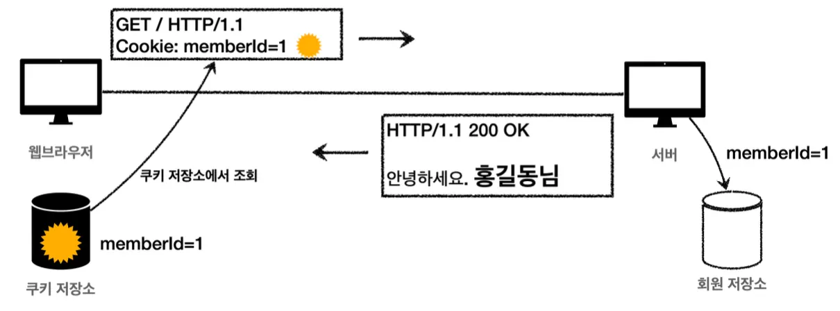 이후 클라이언트에서 요청 시마다 쿠키를 요청 헤더에 담아보내 서버에서 해당 쿠키를 보고 로그인 상태를 확인하는 것이다.