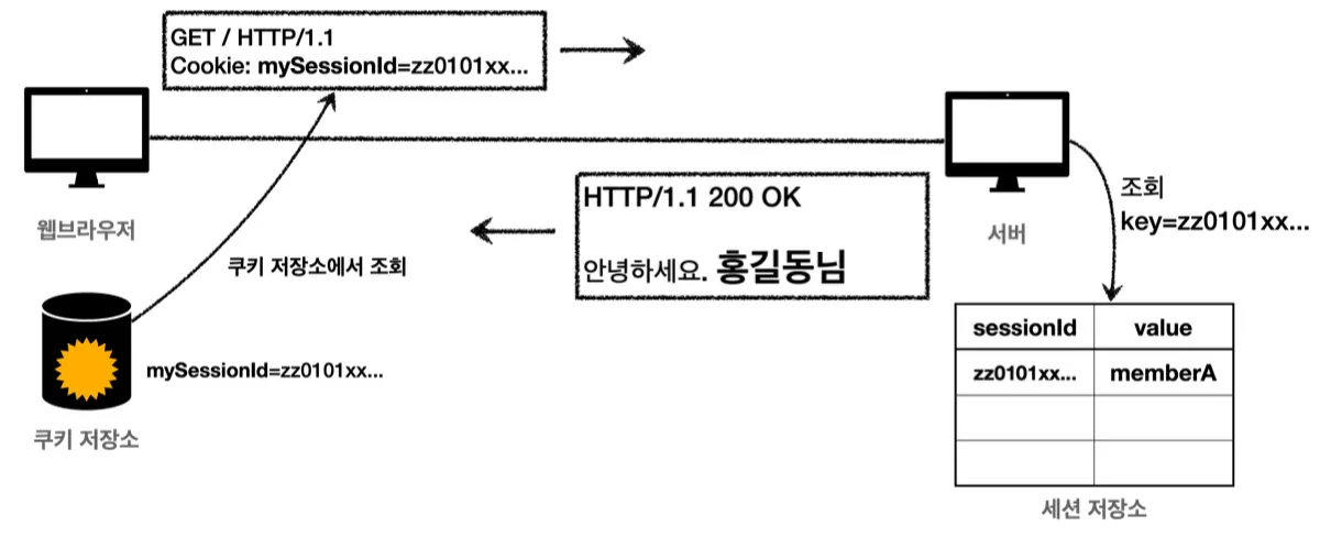 클라이언트에서 해당 쿠키를 사용하여 매 요청마다 로그인 상태를 유지한다. 서버에서는 세션 Id를 기준으로 유저 정보를 찾아 사용자 정보를 확인한다.