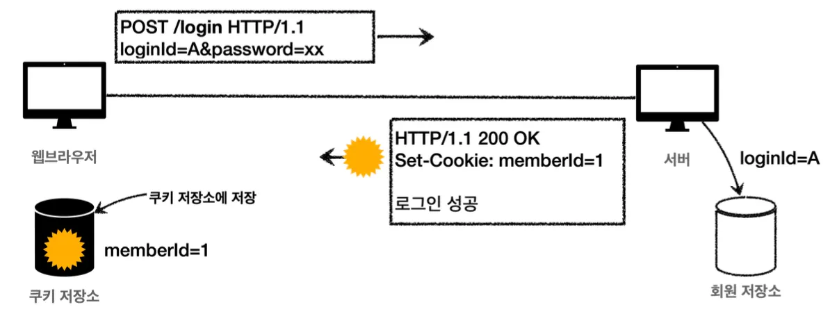 이와 같이 로그인 성공 시에 쿠키를 발급하여 브라우저의 쿠키 저장소에 보관해두고,