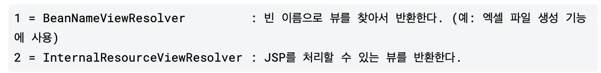 뷰 리졸버는 이와 같은 순서로 뷰를 찾고, 뷰 이름으로 스프링 빈을 등록한게 아니라면 InternalResourceViewResolver가 호출된다.