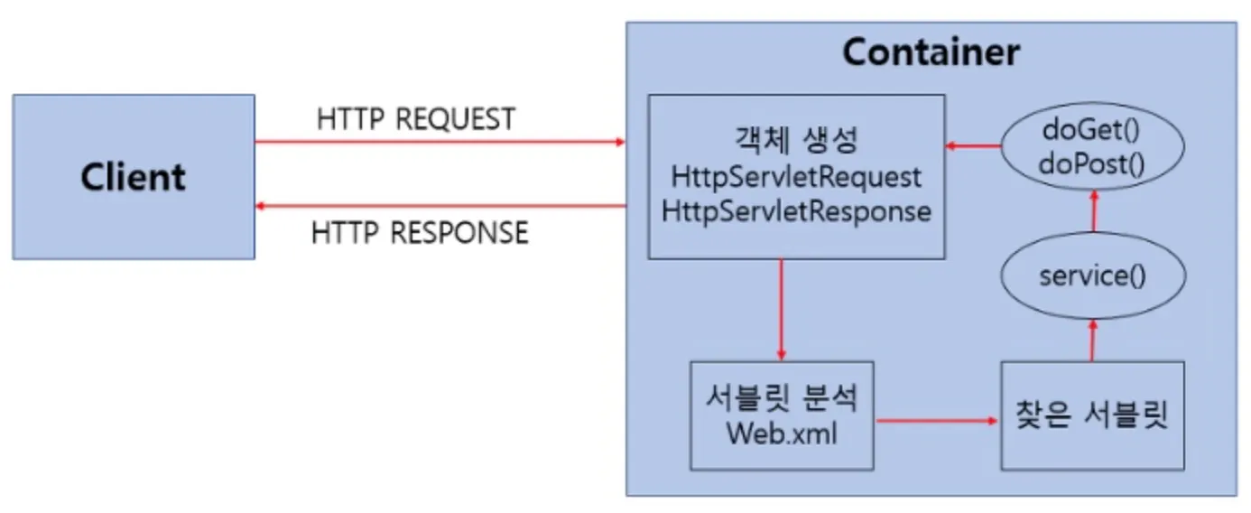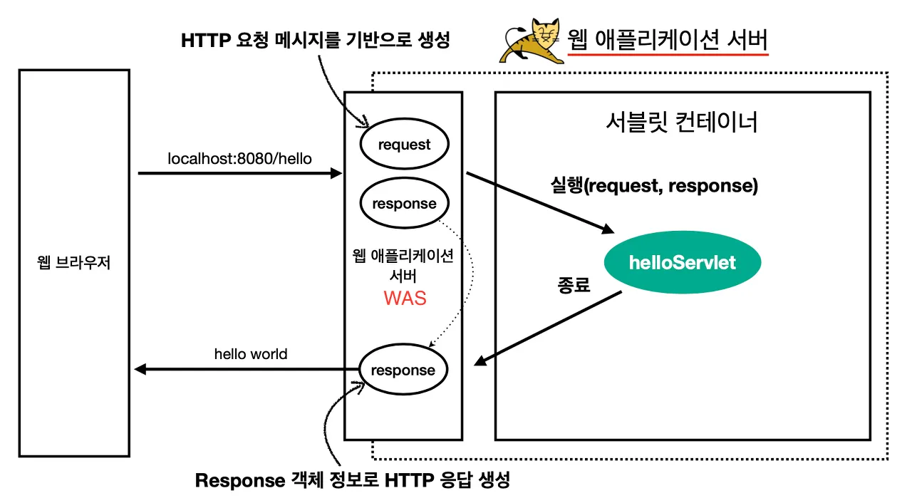 톰캣처럼 서블릿을 지원하는 WAS를 서블릿 컨테이너라 부르고, 서블릿 컨테이너는 서블릿 객체를 생성, 초기화, 호출, 종료(서블릿 객체의 생명주기)를 관리한다.