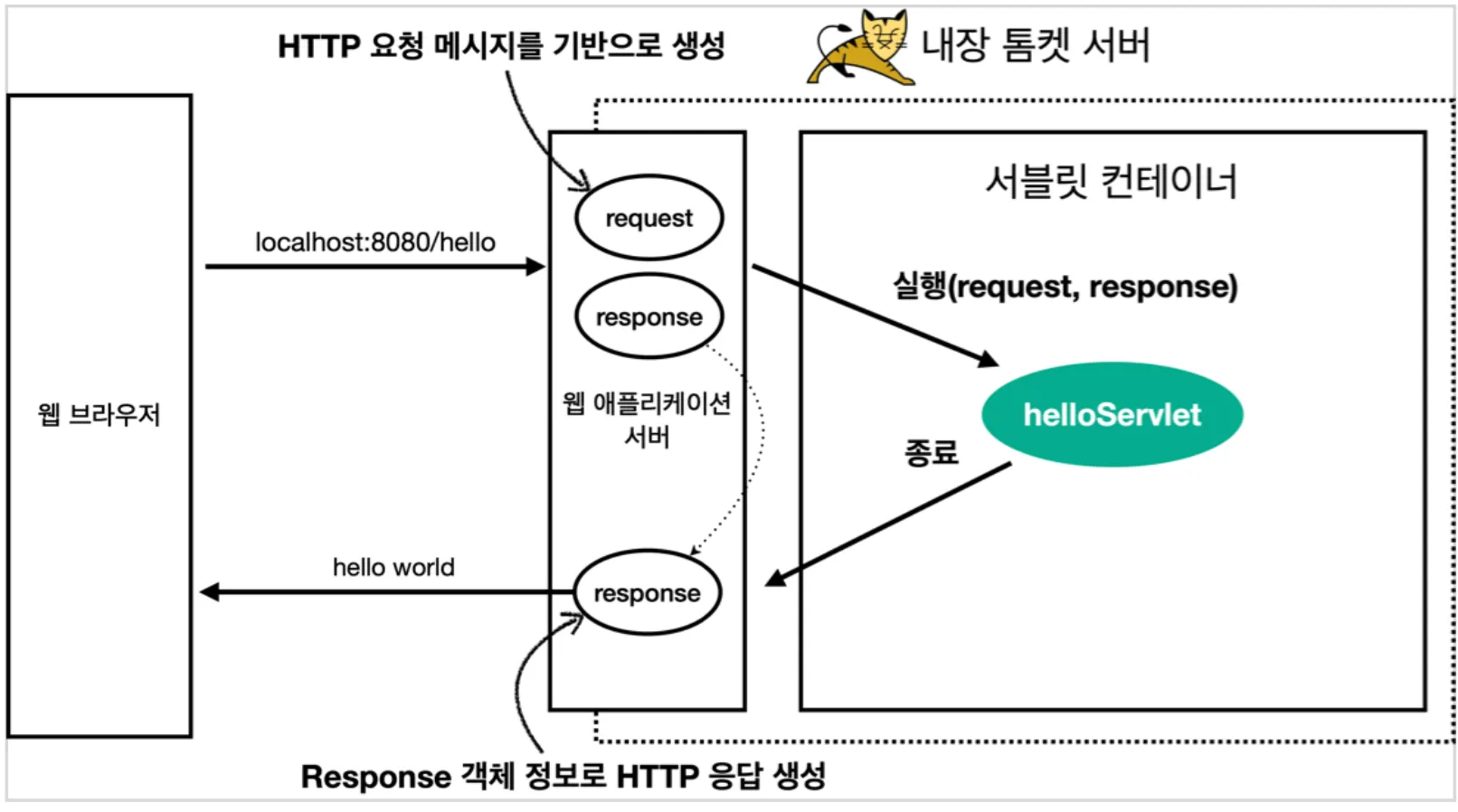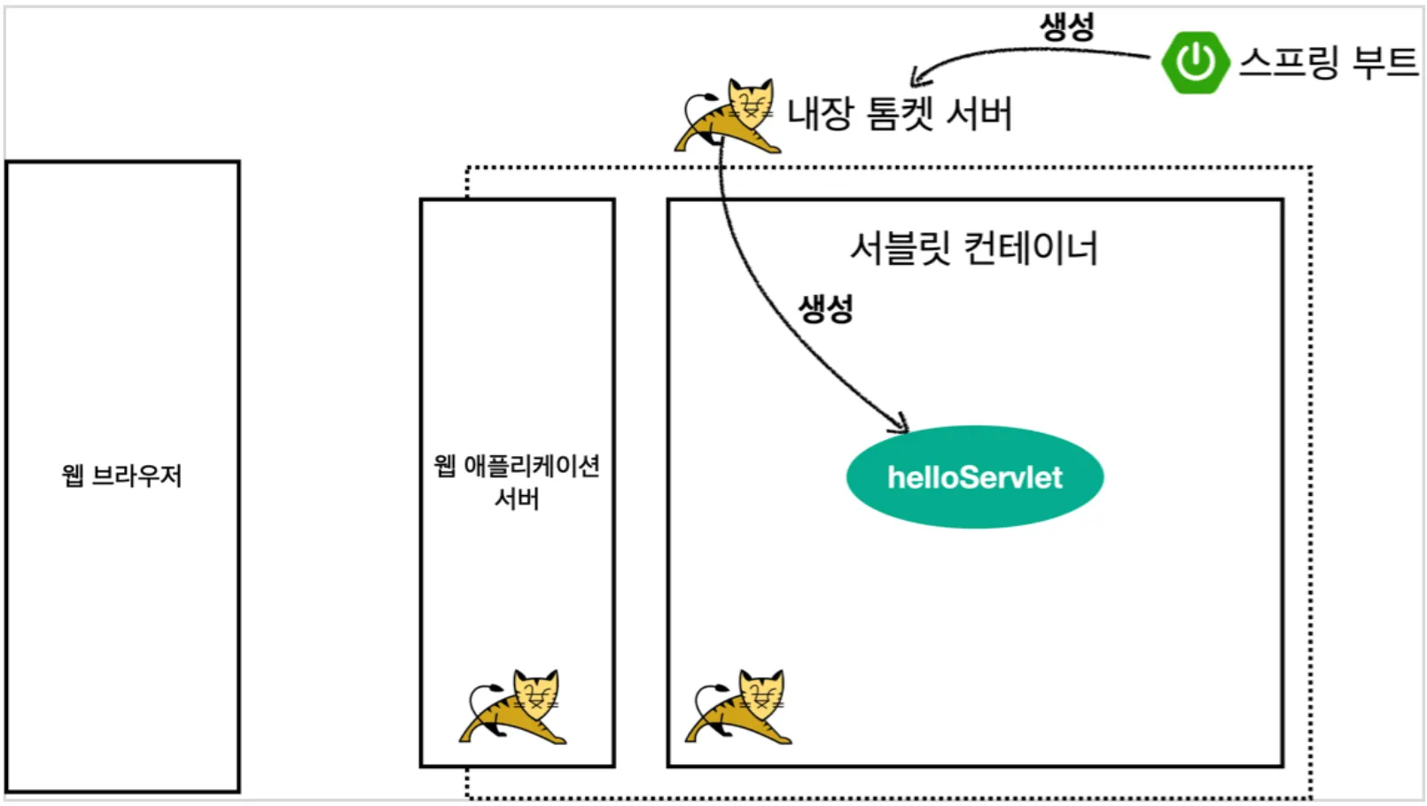 스프링 부트 실행 → 내장 톰캣 서버 실행 → 톰캣 내부 서블릿 컨테이너에서 객체 생성 순으로 실행된다.