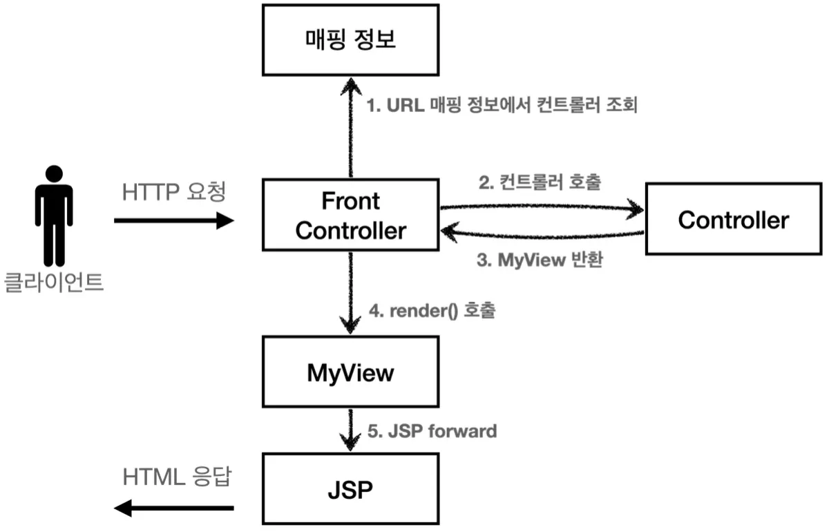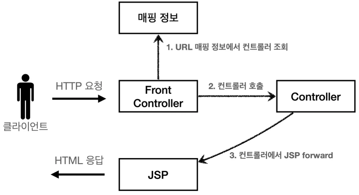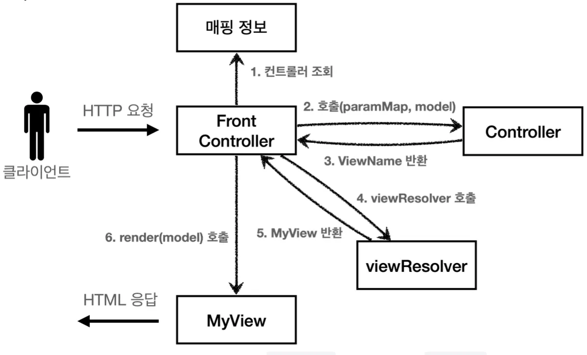 스프링의 실제 MVC 구조를 보면, 몇 가지 이름만 다를 뿐 만들었던 구조와 동일한 것을 알 수 있다.