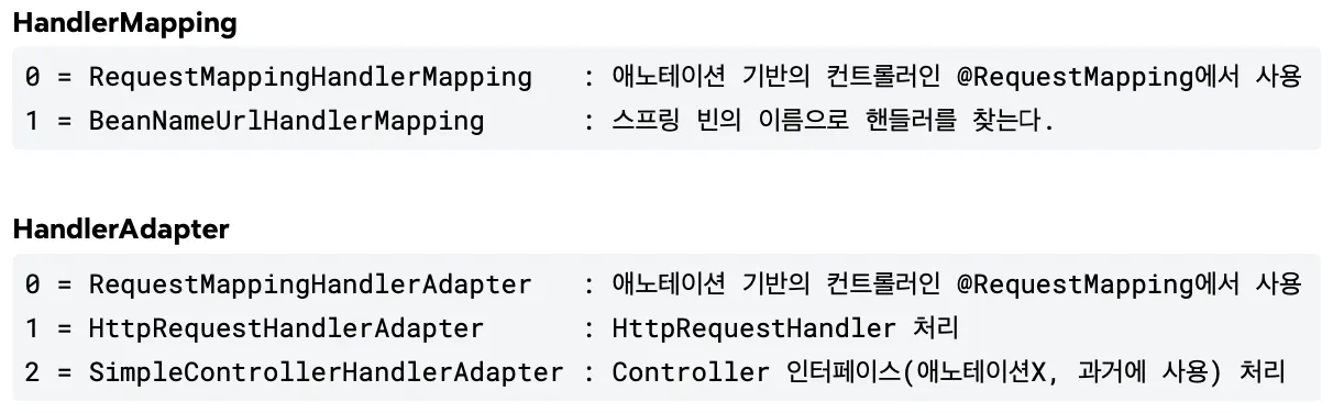 이처럼 URL 이름으로 스프링 빈으로 등록하여 매핑한다. 스프링 빈으로 URL을 매핑하려면 핸들러 매핑 정보에서 스프링 빈 이름으로 핸들러를 찾을 수 있어야한다.