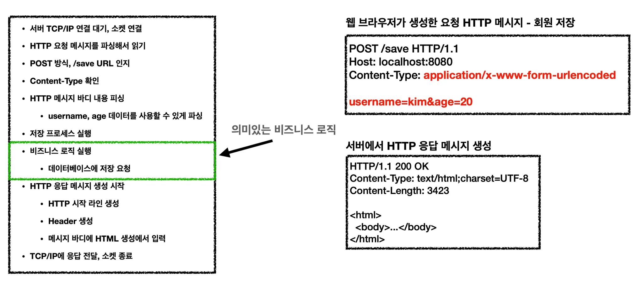 HTTP 요청에서 데이터를 파싱하고, 어플리케이션 로직 결과를 응답 HTTP 메세지로 만드는 과정은 매 요청과 응답마다 동일하고 반복되는 작업이다. 서블릿은 이런 반복되는 과정을 자동화하여 개발자가 의미있는 어플리케이션 로직만 작성할 수 있도록 만들어준다.