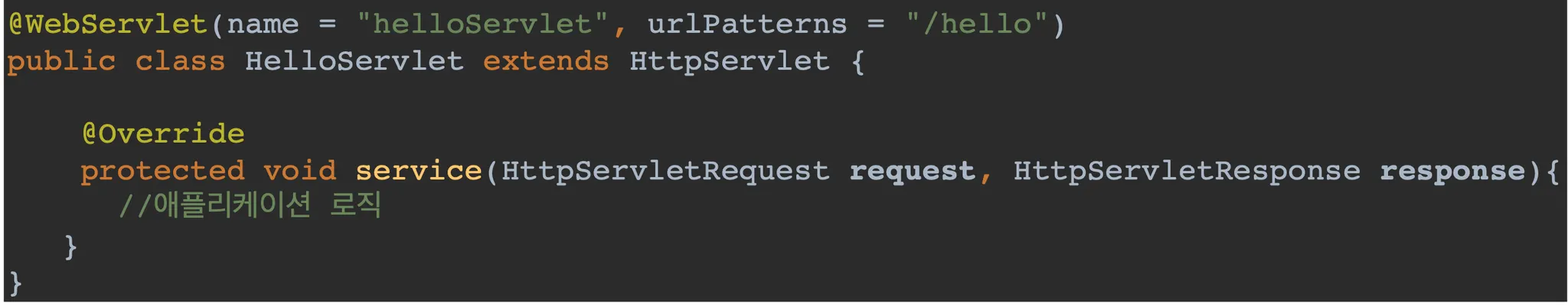 아래 코드와 같이 class에 service를 재정의하면 해당 url로 들어오는 HTTP 요청과 응답은 HttpServletRequest와 HttpServletResponse로 간편하게 처리할 수 있다.