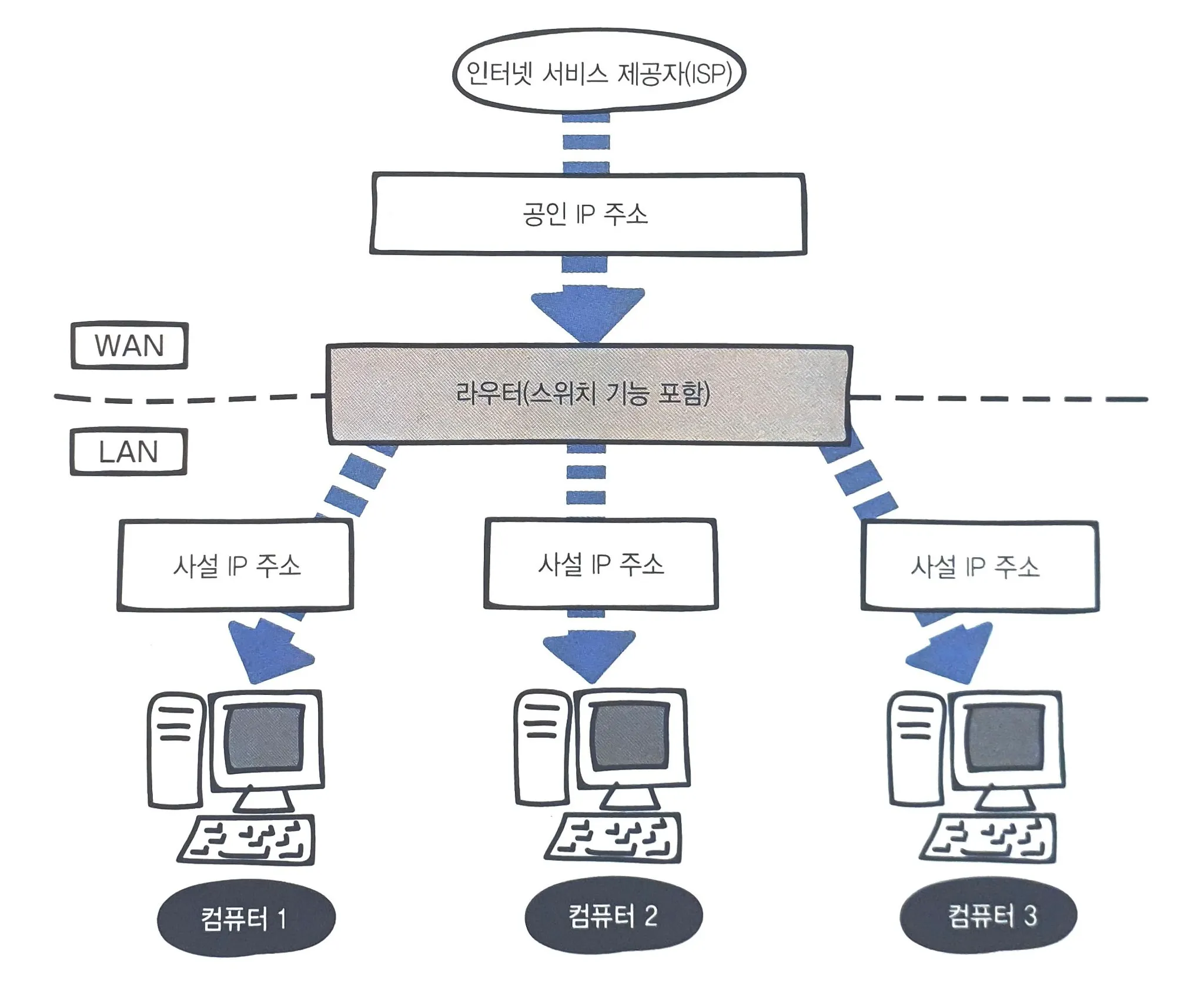인터넷에 직접 연결되는 컴퓨터나 라우터에는 공인 IP를 할당하고, 회사나 가정의 랜에 있는 컴퓨터에는 사설 IP를 직접 할당하거나 DHCP 기능을 사용하여 동적으로 사설 IP 주소를 할당과 해제하는 식으로 부족한 IP 주소를 재사용하고 있다.