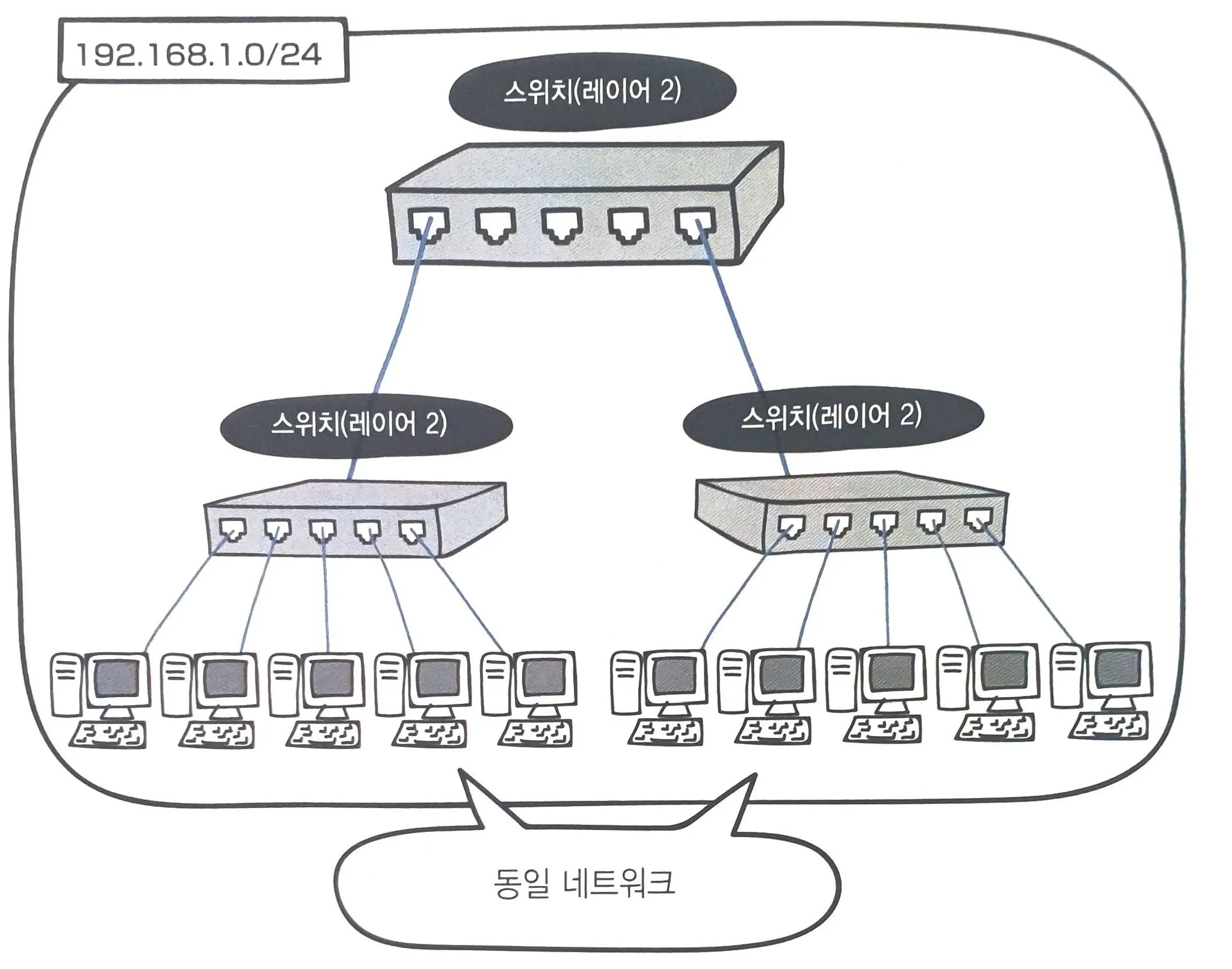 네트워크를 구성할 때 이와 같이 스위치를 통해서 구성하게 되면 전부 동일 네트워크로 묶이게 된다.