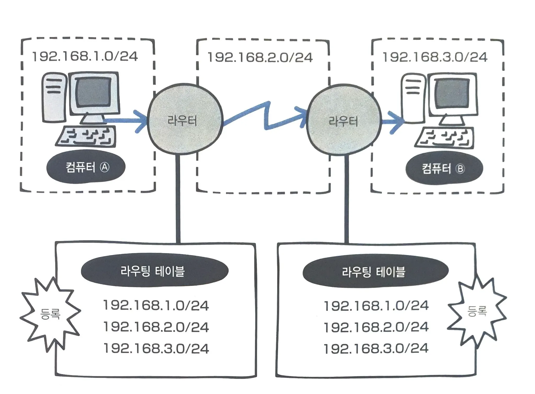 소규모 네트워크에서는 수동으로 라우팅 테이블 등록(정적 라우팅)하여 관리하고, 대규모 네트워크에 적합한 자동으로 라우팅 테이블 등록(동적 라우팅)하도록 한다.