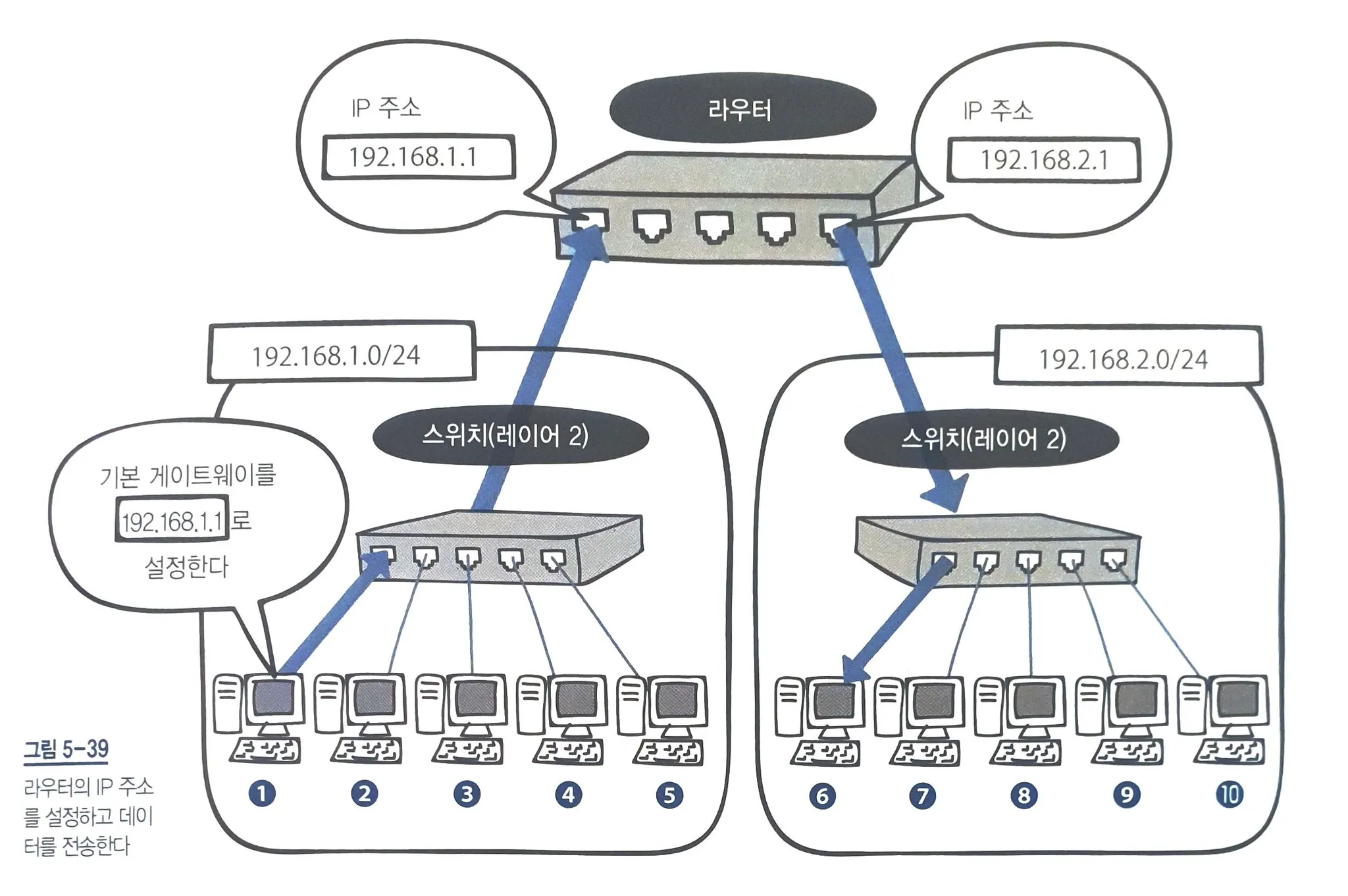 라우터는 이처럼 각 포트에 연결된 L2 스위치로 네트워크를 분리할 수 있고, 네트워크에 속한 컴퓨터가 다른 네트워크와 통신하려면 라우터의 각 포트에 IP 주소를 설정해야한다. 네트워크에 속한 컴퓨터들은 라우터의 포트에 설정된 IP 주소를 통해서 다른 네트워크와 통신하는데, 이를 위해 해당 포트에 설정된 IP를 기본 게이트웨이로 설정해야한다.