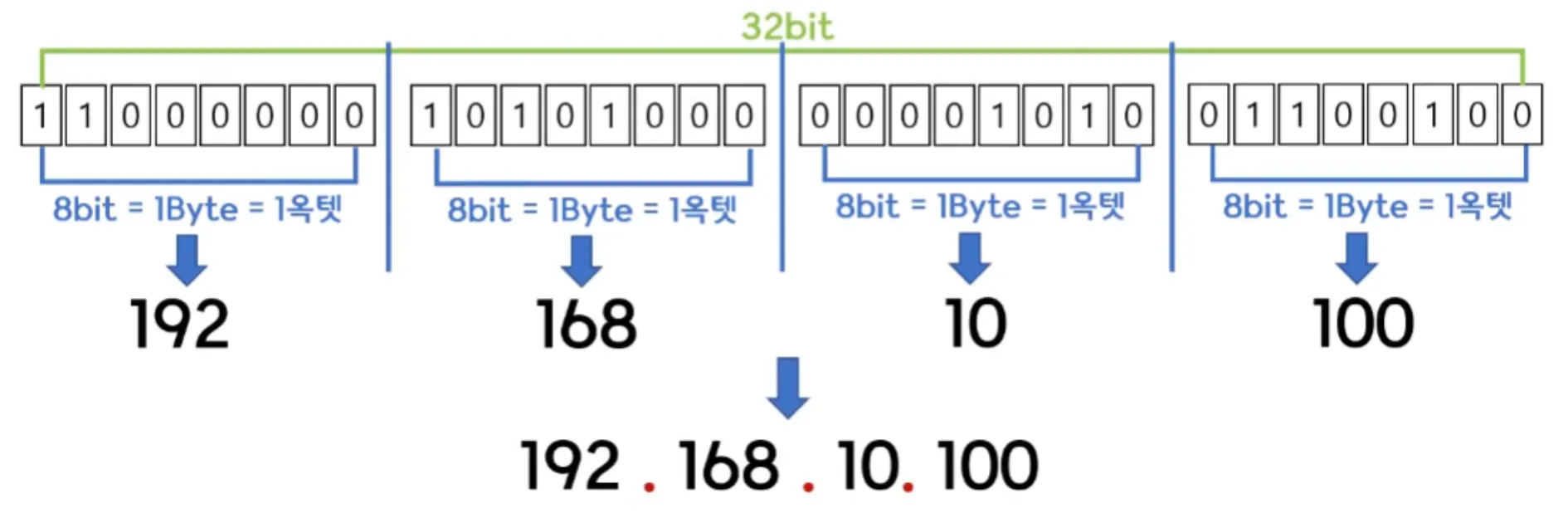 MAC 주소는 48비트 + 16진수로 표기하지만, IP 주소는 32비트를 8비트의 옥텟(Octet) 4개로 나누어 10진수로 표기한다.