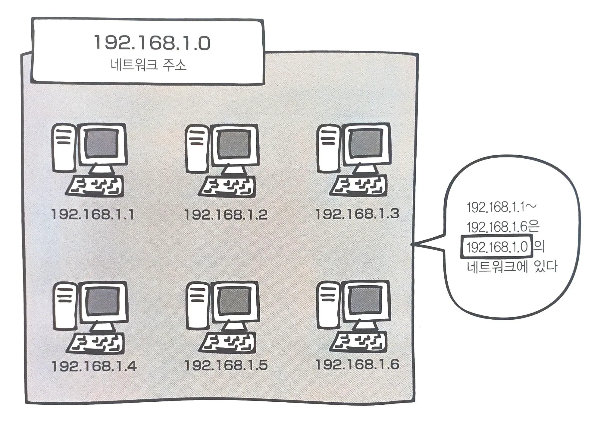 위 그림과 같이 구성된 컴퓨터들이 있고 서브넷 마스크가 /24라면, 컴퓨터들이 속한 네트워크의 네트워크 주소는 192.168.1.0이 된다.