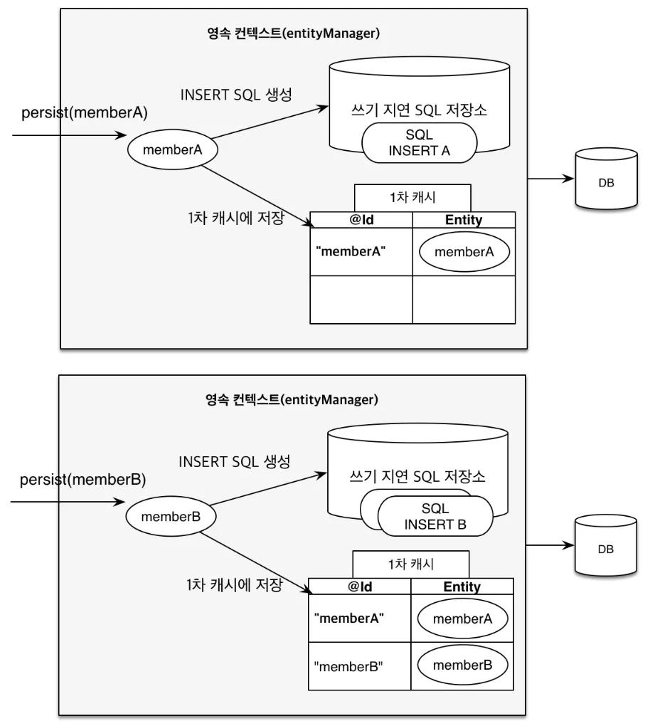 이처럼 em.persist()를 호출한다고 하여 바로 SQL을 날리는 것이 아니라,