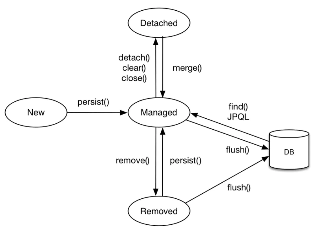 이러한 영속성 컨텍스트에서 관리되는 엔티티의 생명주기는 다음과 같다.