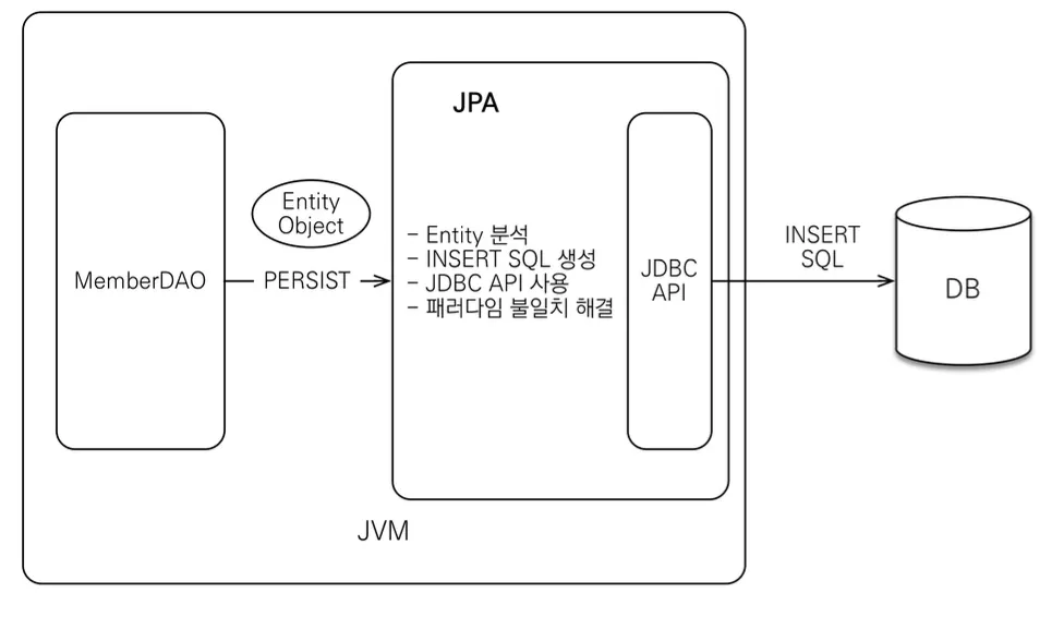 JPA를 통해 저장하게되면 JPA가 Entity를 분석 후 Insert 쿼리를 대신 작성하여 JDBC API를 호출하여, 페러다임의 불일치를 해결해준다.