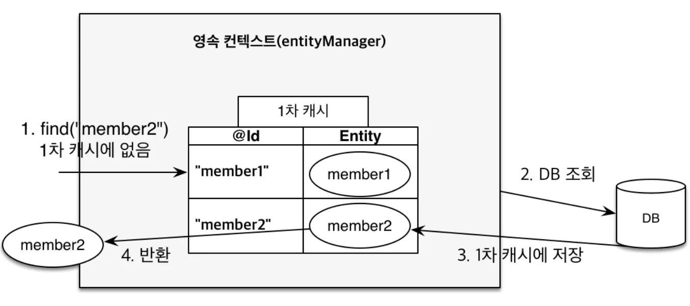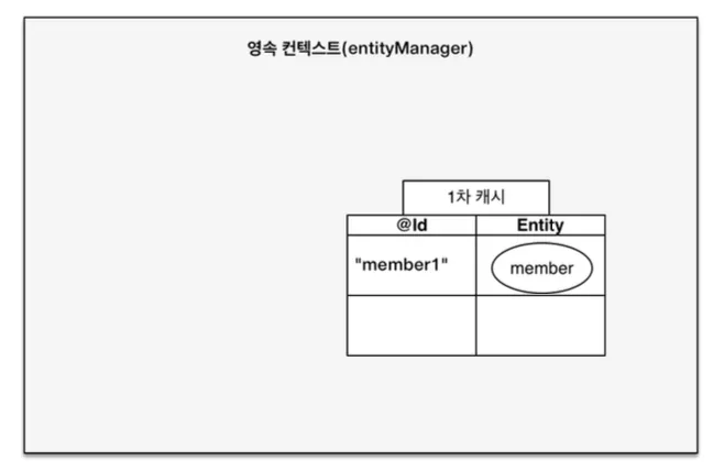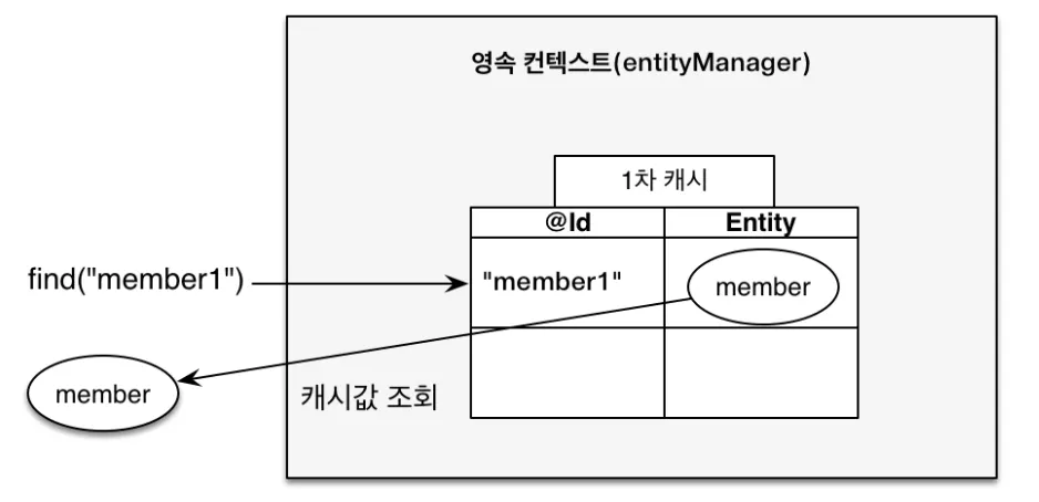 영속성 컨텍스트 내에서 엔티티를 1차 캐시에 저장해두고, 조회 시 영속성 컨텍스트에서 관리하는 엔티티라면 1차 캐시에서 조회한다.