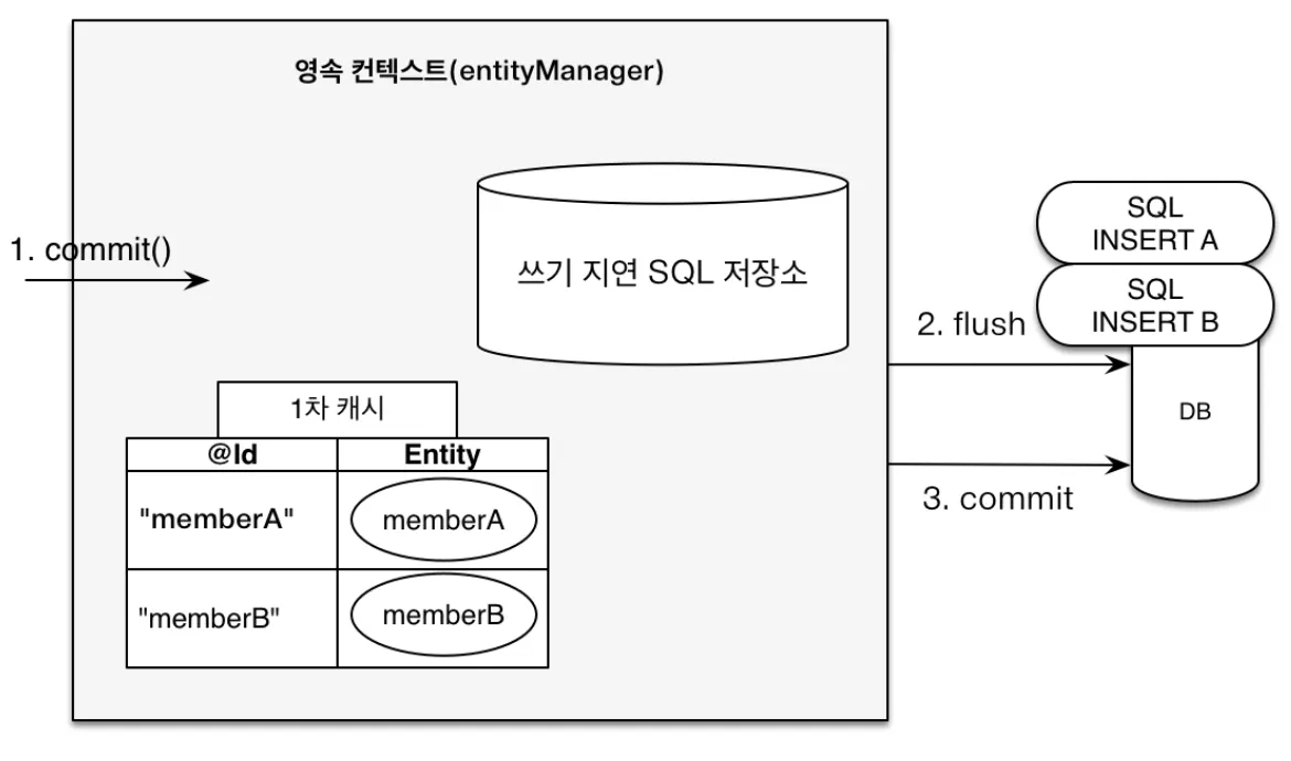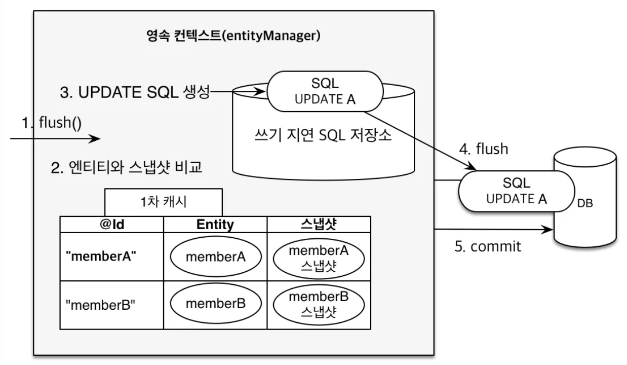 플러시는 em.flush()를 통해 직접 호출하는 방법이 있고, 트랜잭션 커밋 혹은 JPQL 쿼리 실행 시 자동으로 플러시가 호출되게 된다.