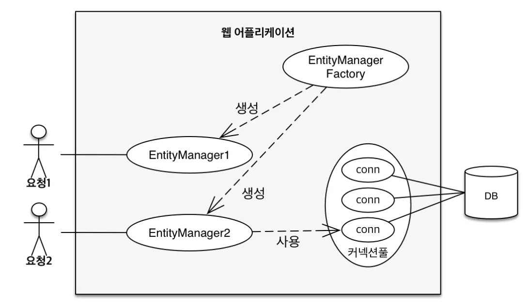 우리가 데이터베이스에 접근할 때, 엔티티 매니저 팩토리에서 엔티티 매니저를 생성받아 커넥션 풀에서 커넥션을 받아서 연결 후 데이터베이스에 접근한다.