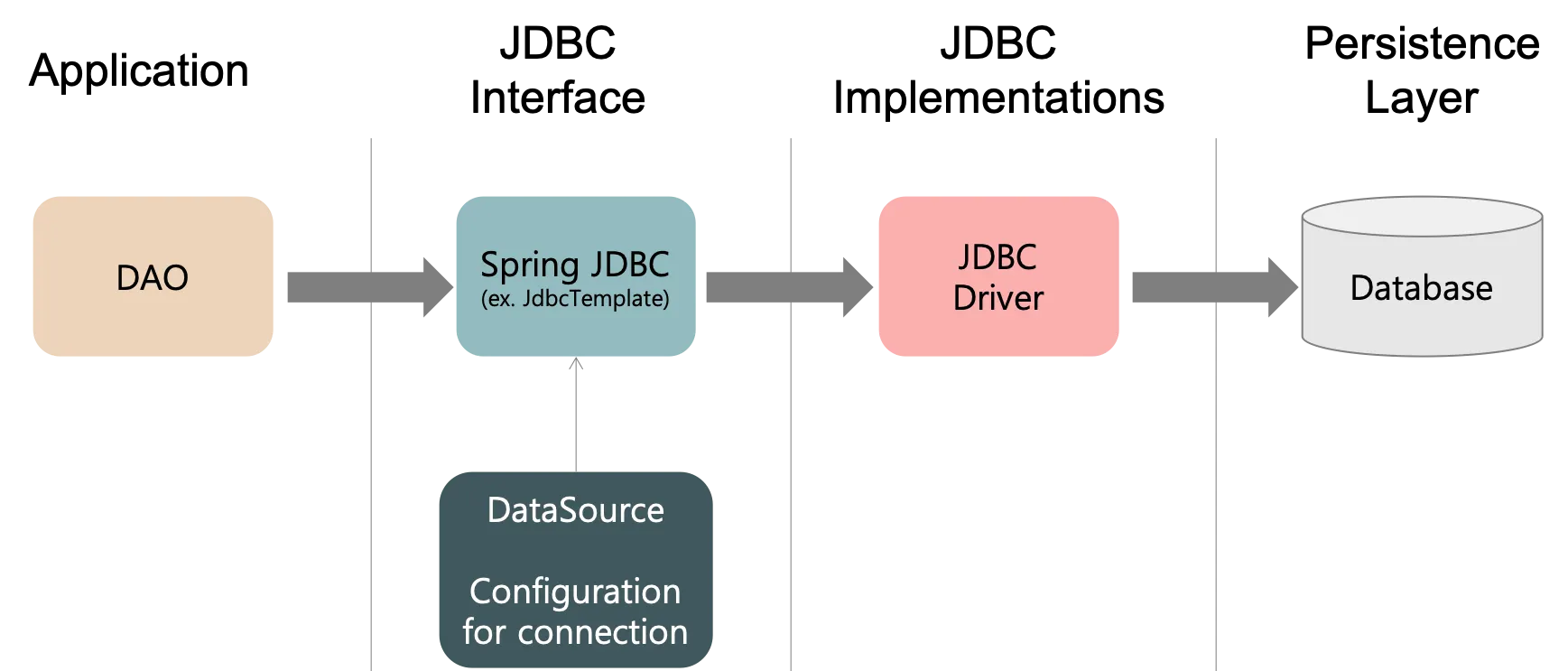 JDBC 드라이버에서 데이터베이스와 통신을 담당하여, Oracle이나 MS SQL, MySQL 등 다양한 데이터베이스에 맞게 JDBC 드라이버를 구현해두고 제공한다. 이를 통해 개발자는 DB의 종류를 고려하지 않고 Java 코드를 작성할 수 있다.