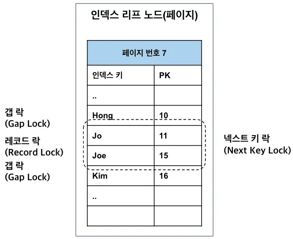 위 테이블은 last_name이 J로 시작하는 모든 레코드를 검색한 결과로, 인덱스를 통해 수행된다. 이와 같은 상황에서 인덱스를 통해 검색되는 모든 레코드에 레코드 락이 걸린다(Jo, Joe). 인덱스를 통해 검색된 모든 레코드 락이 걸리고, 만약 적당한 인덱스가 없다면 테이블의 모든 레코드에 락을 걸고 풀스캔을 시행하기 때문에 동시성이 떨어져 성능에 큰 영향을 미친다.
