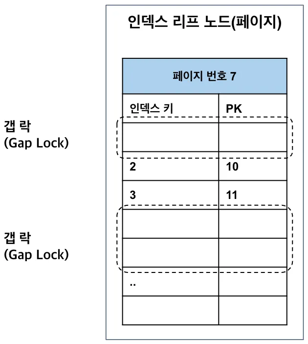 갭 락은 레코드가 아닌 레코드와 레코드 사이의 간격(Gap)을 잠금으로써 레코드의 생성 및 수정, 삭제를 제어하는 방식이다. 여기서의 갭이란 인덱스 중 DB에 실제 레코드가 없는 부분을 의미한다.