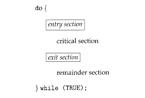 critical section: 임계 구역. 한 프로세스가 임계 구역에 진입 중이면 다른 프로세스는 접근할 수 없다.