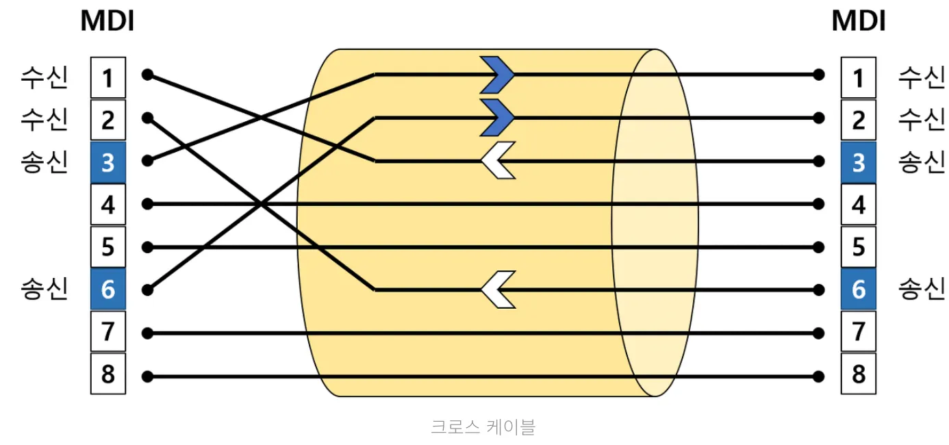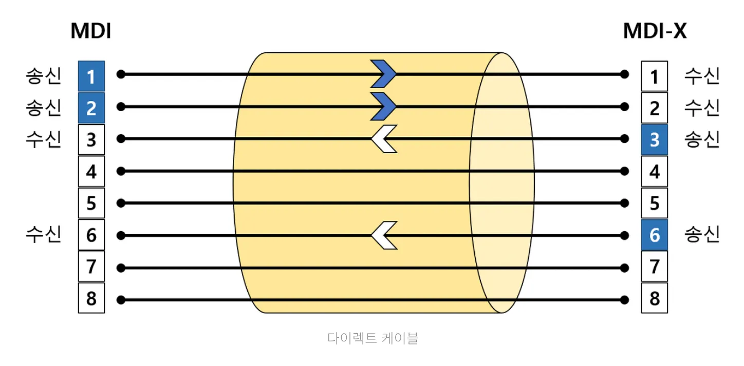 MDI 규격과 MDI-X 규격은 서로 반대의 구조로 볼 수 있는데, 양측이 MDI 규격을 사용 중이면 둘 다 1, 2번으로 송신을 하려 하기 때문에 다이렉트 케이블을 사용하면 충돌이 발생한다.