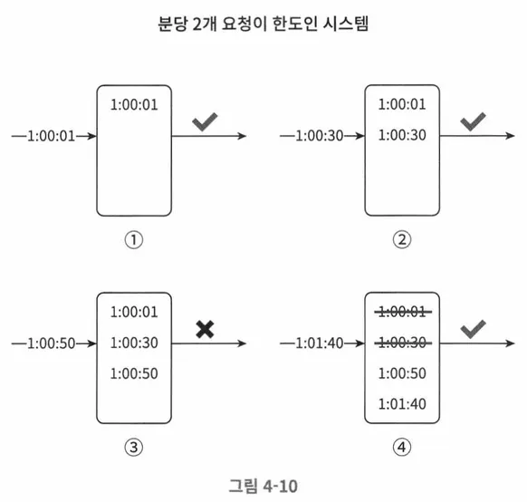 새 요청의 타임스탬프를 로그에 추가하고, 로그에 크기가 허용치 이내라면 요청을 전달하고 아니면 처리를 거부한다.