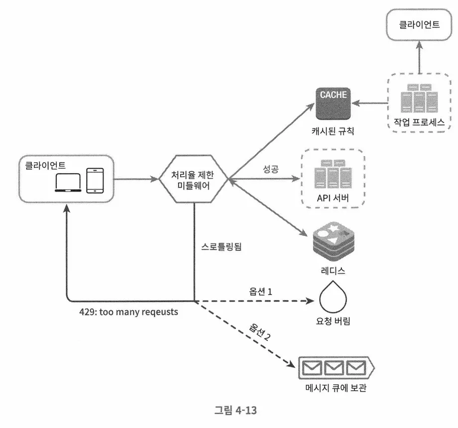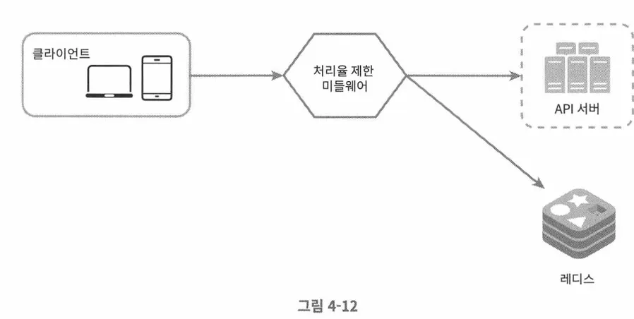 클라이언트가 요청을 서버에 보내면, 처리율 제한 미들웨어서 레디스를 통해 카운터나 타임스탬프를 가져오고 규칙에 따라 요청을 처리하거나 거부한다.