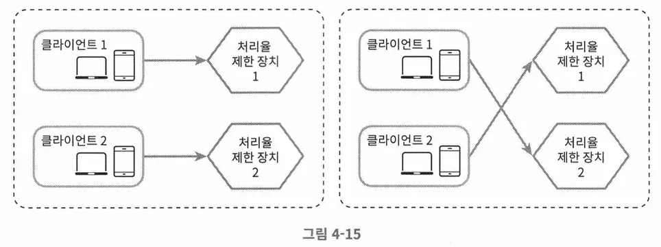위처럼 두 대의 처리율 제한 장치를 둔다면, 각각의 클라이언트가 요청을 보냈을 떄 해당 클라이언트의 정보를 처리율 제한 장치에서 알 수 없는 경우가 생긴다.