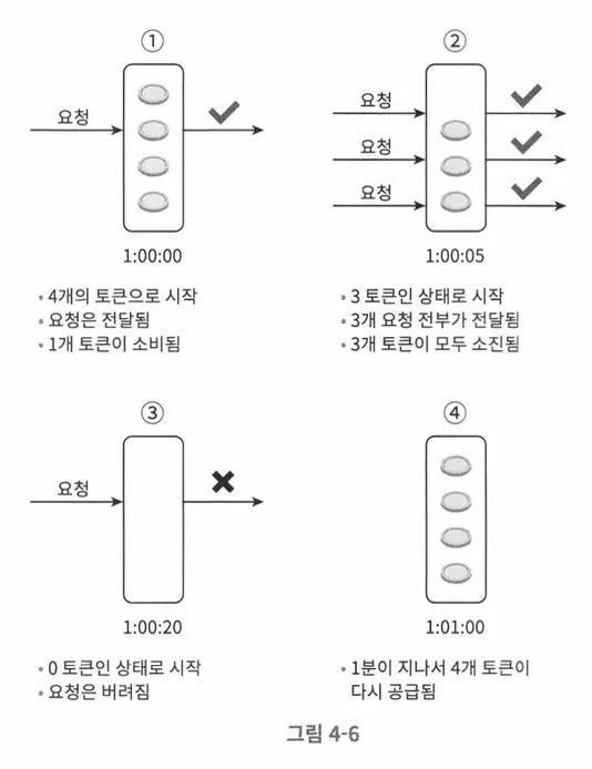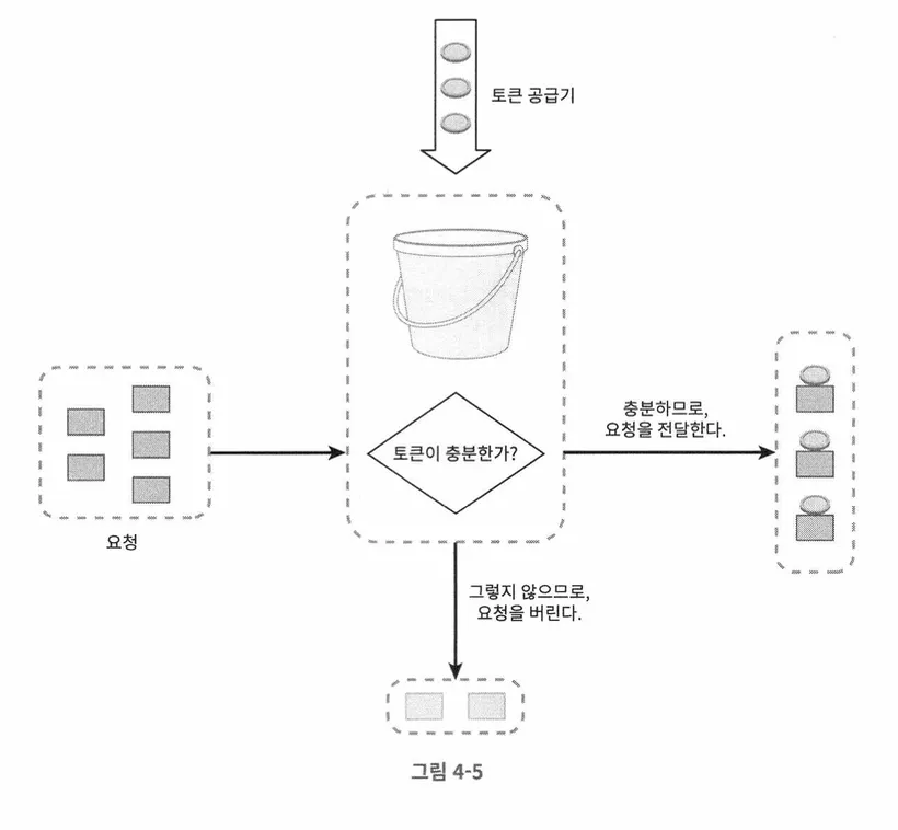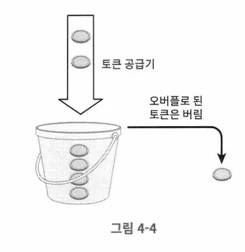 지정된 용량을 갖는 컨테이너인 토큰 버킷을 두고, 사전 설정된 양의 토큰이 주기적으로 채워진다. 버킷에 토큰이 꽉 차있다면 더 이상 토큰이 추가되지 않는다.