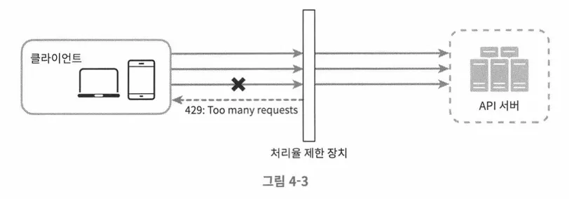 처리율 제한 장치(rate limter)는 클라이언트 또는 서비스가 보내는 트래픽의 처리율(rate)을 제어하기 위한 장치이다. HTTP에서는 특정 기간 내에 전송되는 클라이언트의 요청 횟수를 제어한다. API 요청 쵯수가 제한 장치의 임계치(threshold)를 넘어서면, 추가로 도달한 모든 호출은 처리가 중단된다.