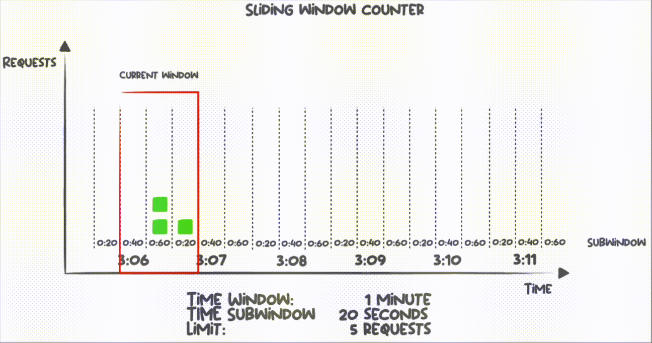 Sub window 방식은 이동하는 윈도우를 여러 개의 sub 윈도우로 쪼개고, 전체 윈도우와 윈도우 내 각각의 sub 윈도우에서 처리율을 제한하는 방식이다.