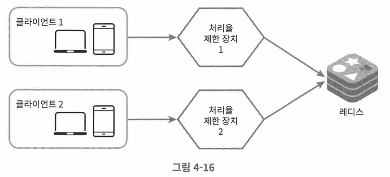 수백만 사용자를 한 대의 처리율 제한 장치 서버로 처리하는 것은 충분하지 않을 수 있다. 때문에 여러 대의 처리율 제한 장치를 둔다면 동기화가 필요해진다.