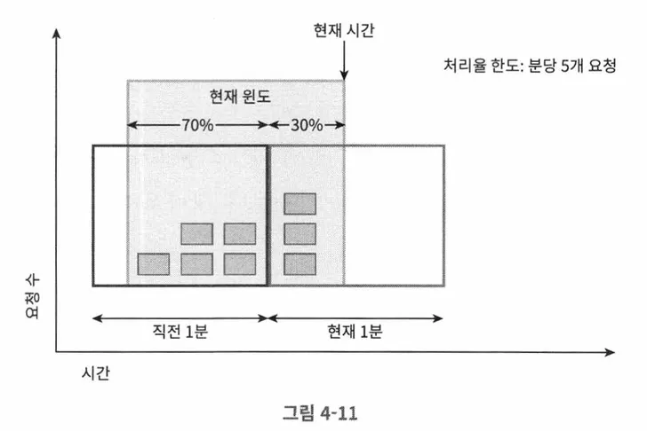 예를 들어 윈도우 크기가 1분이고 처리율이 5일 때, 고정 윈도우 13:00~13:01에 요청 5개 현재 13:01:15에 요청이 2개 들어온 상황이라면, 5 * 45/60 + 2 = 3.75 + 2 = 5.75로 새로운 요청은 버려진다. 하지만 13:01:30였다면, 5 * 30/60 + 2 = 2.5 + 2 = 4.5로 새로운 요청은 처리된다. 여기서 소수점은 올리거나 내리거나 자유롭게 정할 수 있다.